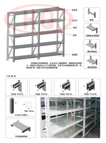 采用輥壓成型的立柱,配合橫/斜撐連接而成的立柱片,掛接多種擱板,貨架穩(wěn)定性高,承載力較強(qiáng),安裝拆卸方便,層間距可調(diào),每層層板均布載荷范圍在100-600Kg之間,主要用于小件物品的儲存,可配合零件盒、周轉(zhuǎn)箱使用。貨架可以單排或背靠背排放,貨架通道約900-1100mm,采用人工揀選儲存。廣泛應(yīng)用于倉庫、物流配送中心、備件庫、車間暫存區(qū)等場所。