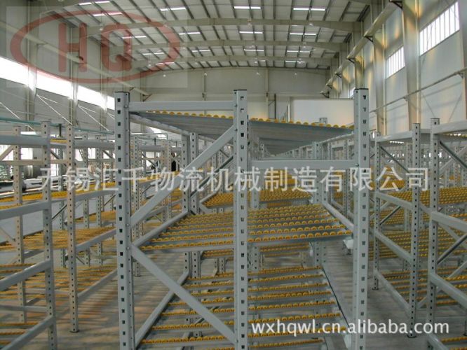 流利式貨架結構特點:流利式貨架的流利條直接連接到前后橫梁及中間支撐梁上,橫梁直接掛在支柱上,流利條安裝傾斜度取決于貨箱的尺寸、重量以及流利架的深度,通常取5%~9%。流利條滾輪的承載力為6kg/只,當貨物較重時,可以在一個滾道安裝3-4根流利條。通常在深度方向上每隔0.6m安裝一根支撐梁以增加流利條的剛度。當滾道較長時,可用分隔板將滾道隔開。取貨端需安裝制動片使貨物減速,降低沖擊。