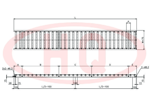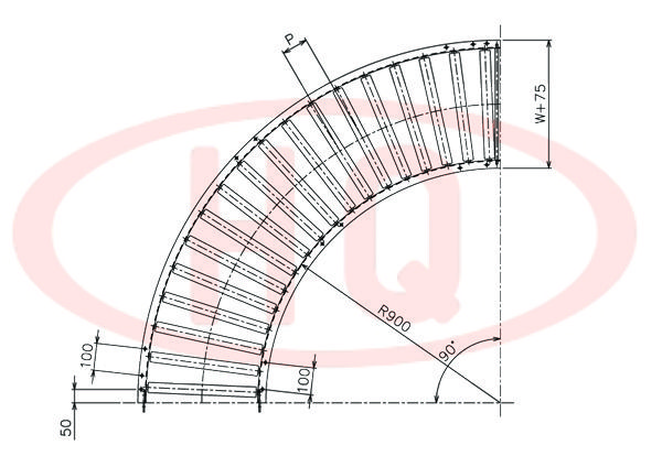 | 型 號 | 滾筒外徑(φ)×壁厚(t) 軸承 | 軸外徑(φ)×壁厚(t) 加工 | 支架形狀I×K×t | 機 長 L | 滾筒幅寬 W | 滾筒間距 P | 轉彎半徑 R | |||||